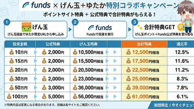 クラファン投資 【1/2まで】げん玉コラボ特別URL爆誕!堅実イチバンのFundsが大チャンスな件! 2025年12月30日 ゆたか Fundsを始める大チャンスが来ました! 特別URLをいただき、高還元額でFundsを利用することができます。 ハッキリ …