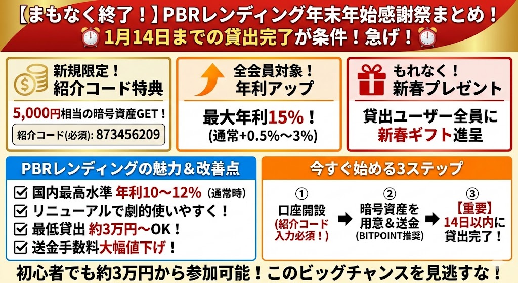 【1/14まで!】PBRレンディングの年末年始感謝祭が終了間近!5,000円+お得な特典を見逃すな!