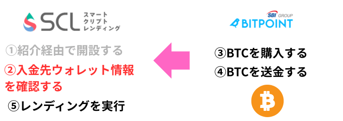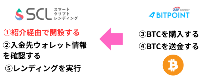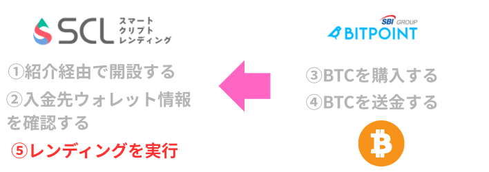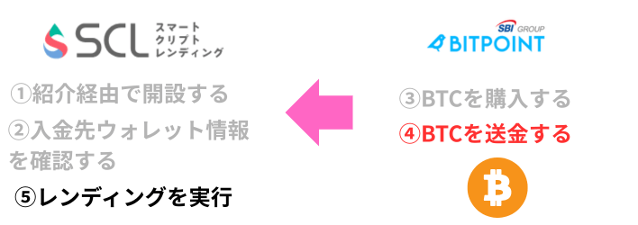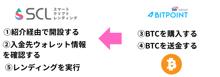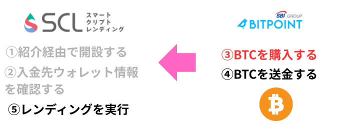 こんな流れとなります。今回はBITPOINTでBTCを購入し、スマートクリプトレンディングでレンディングする方法を解説します。