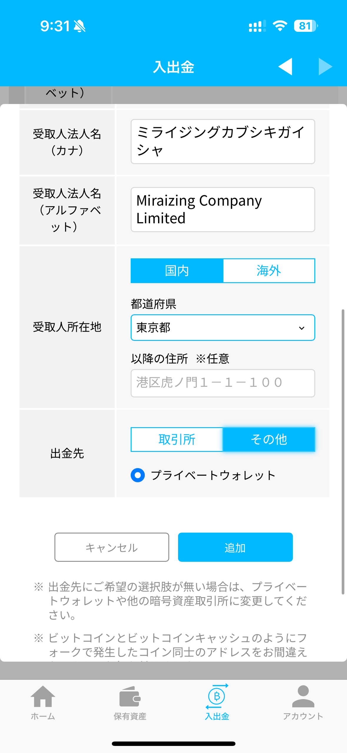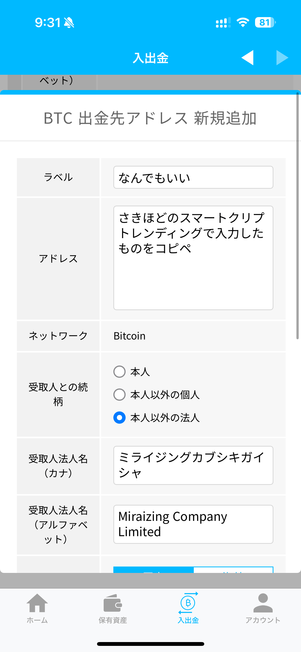 - 出金目的 その他「レンディングサービスの利用」と入力