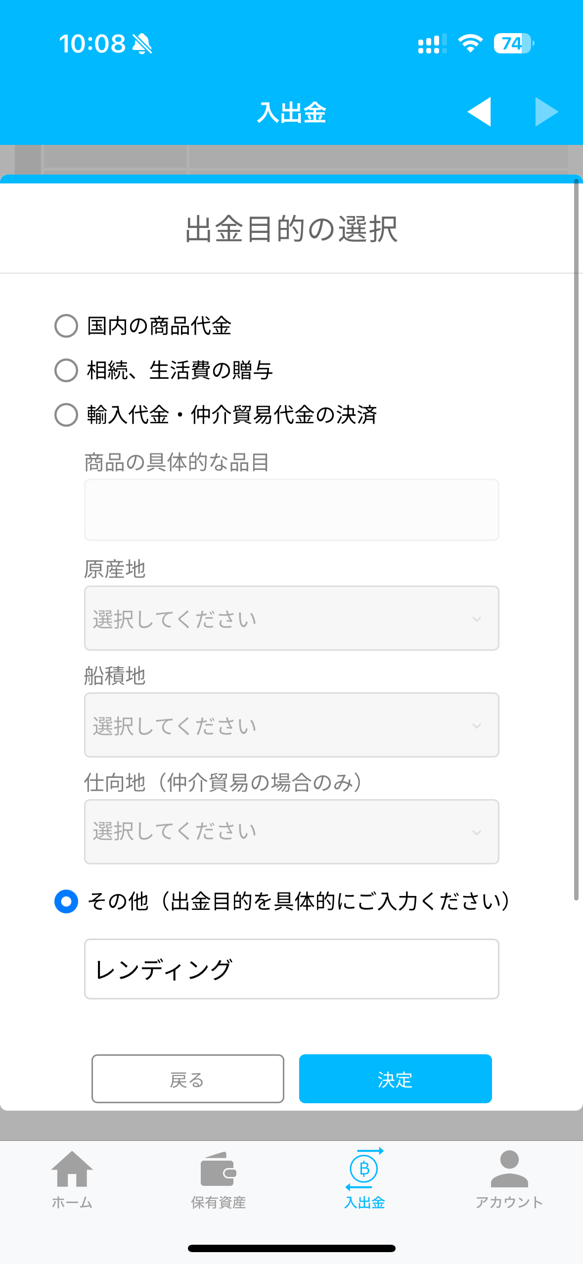 送金数量を入力して確認画面に飛んだあとは出金目的の選択と表示されますが、