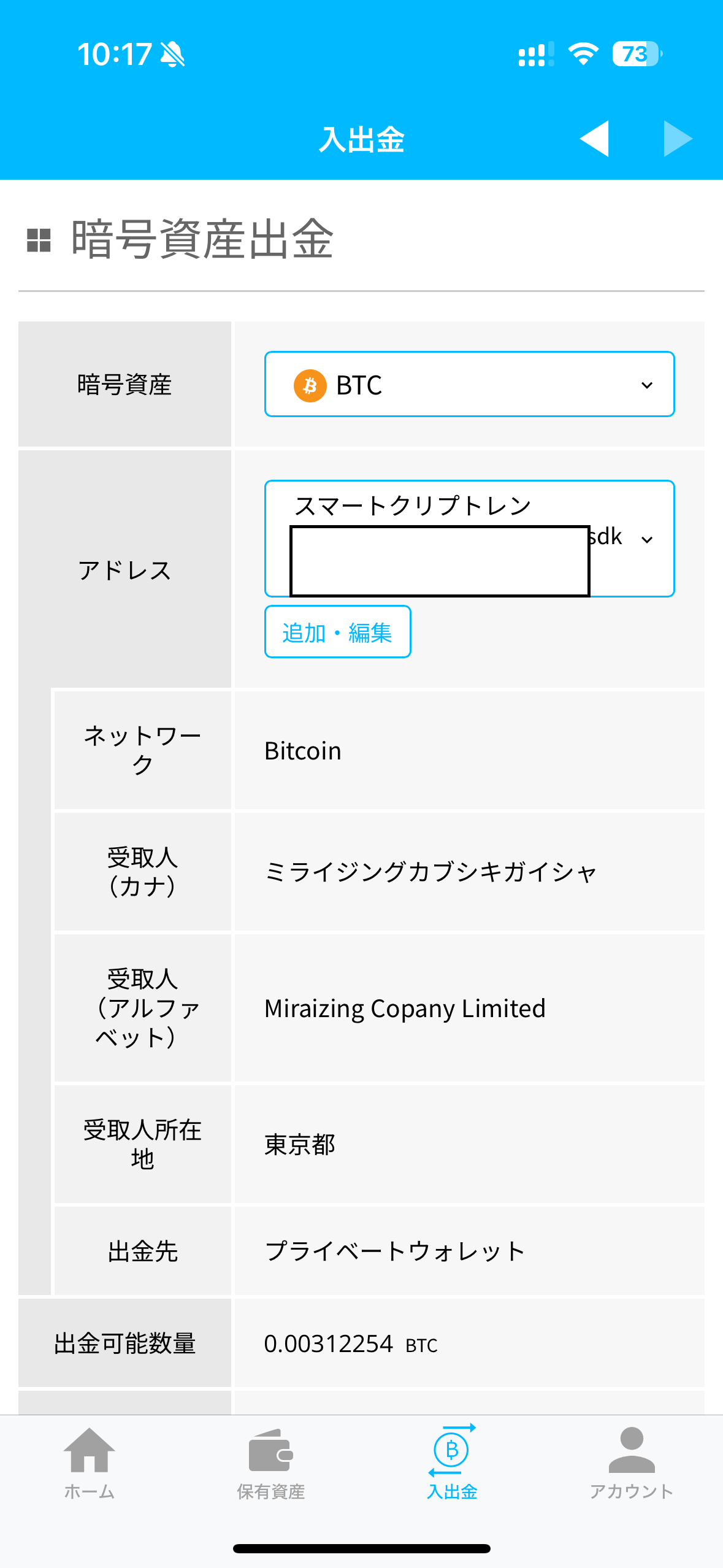 認証が終わるとアドレス帳に登録されるようになるので、出金することができるようになります。