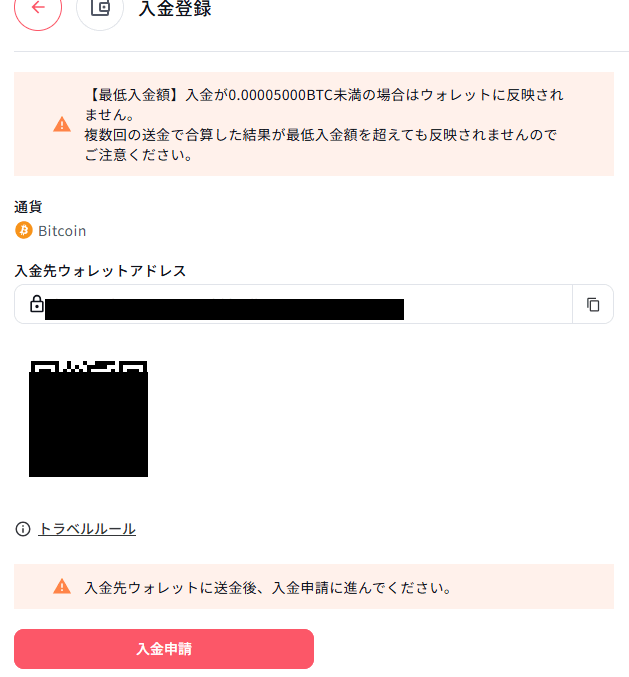 今回の例ではBTCにしてみます。入金を押すと入金先ウォレットアドレスが表示されます。