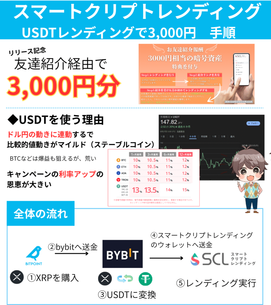 - BybitからUSDTをスマートクリプトレンディングに送金(手数料1USDT)