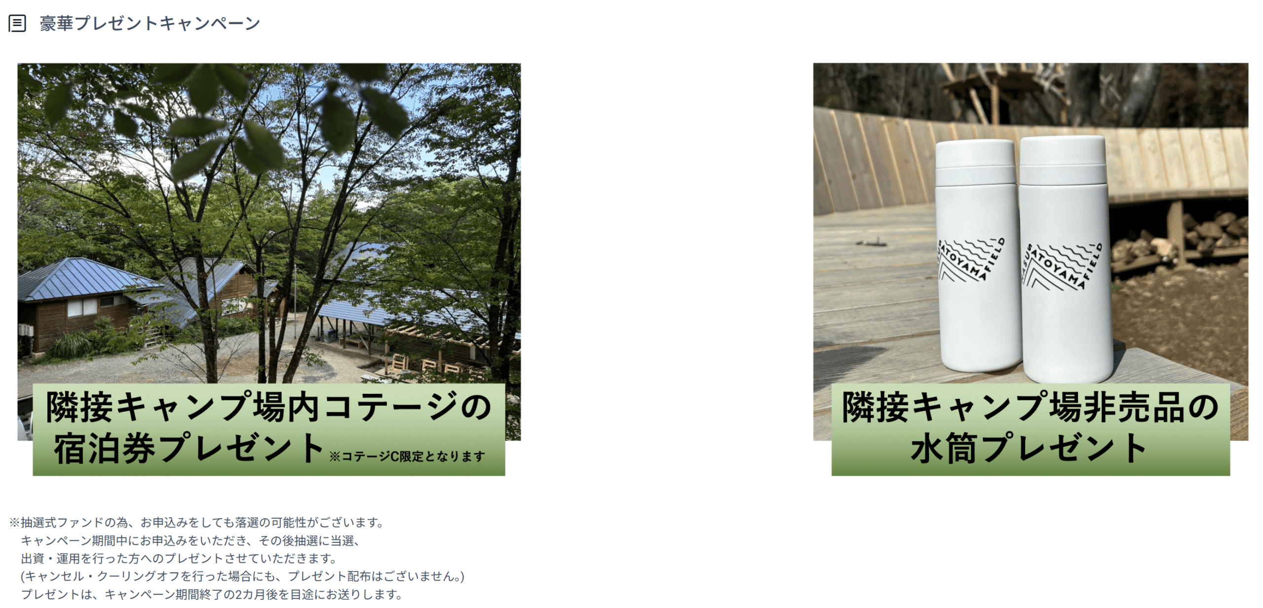 投資金額に応じて抽選でコテージ宿泊券をもらうことができたり水筒を貰えたり、お得な優待キャンペーンも開催されているのでこういう優待品を活用できる方は投資も参考にしてみてね