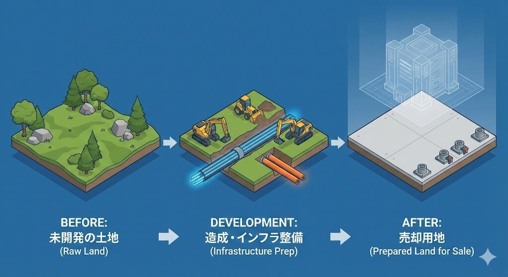ざっくりいうとデータセンターを建設するための『土地』を確保し、それを開発事業者(デベロッパーやIT企業)に売却する案件です。