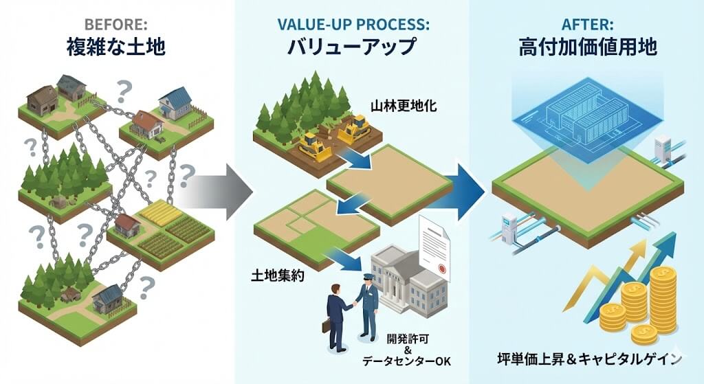 これにより、土地の面積や用途が広がり、利用価値が跳ね上がるという仕組み