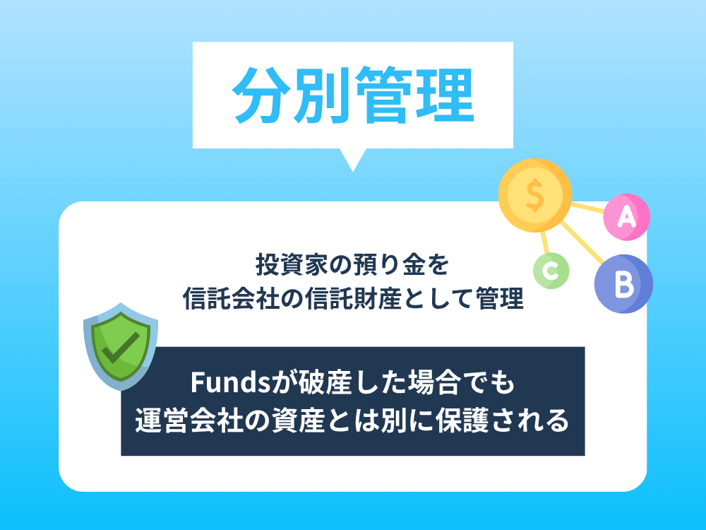 Fundsでは、投資家の預り金を信託会社の信託財産として管理する「分別管理」を採用。