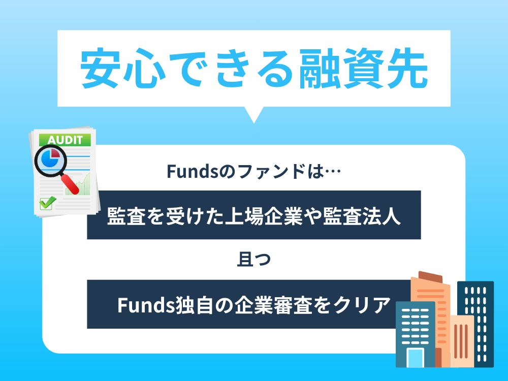 Fundsはそうしたリスクを避けるため、上場企業や監査法人の監査を受けた企業だけを対象にし、独自の厳格な審査を実施しています。