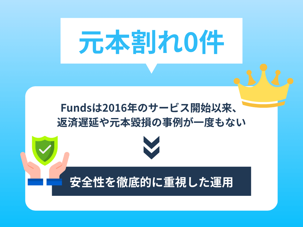 Fundsは2016年のサービス開始以来、返済遅延や元本毀損の事例が一度もありません。