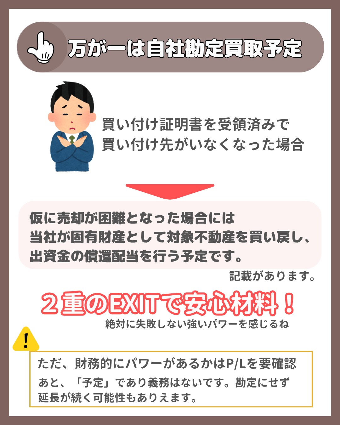 とはいえ、買戻し用に現金を今手元に用意してるというわけではないため、仮に買戻しとなった場合は償還まで時間がかかるなどはありそうです。