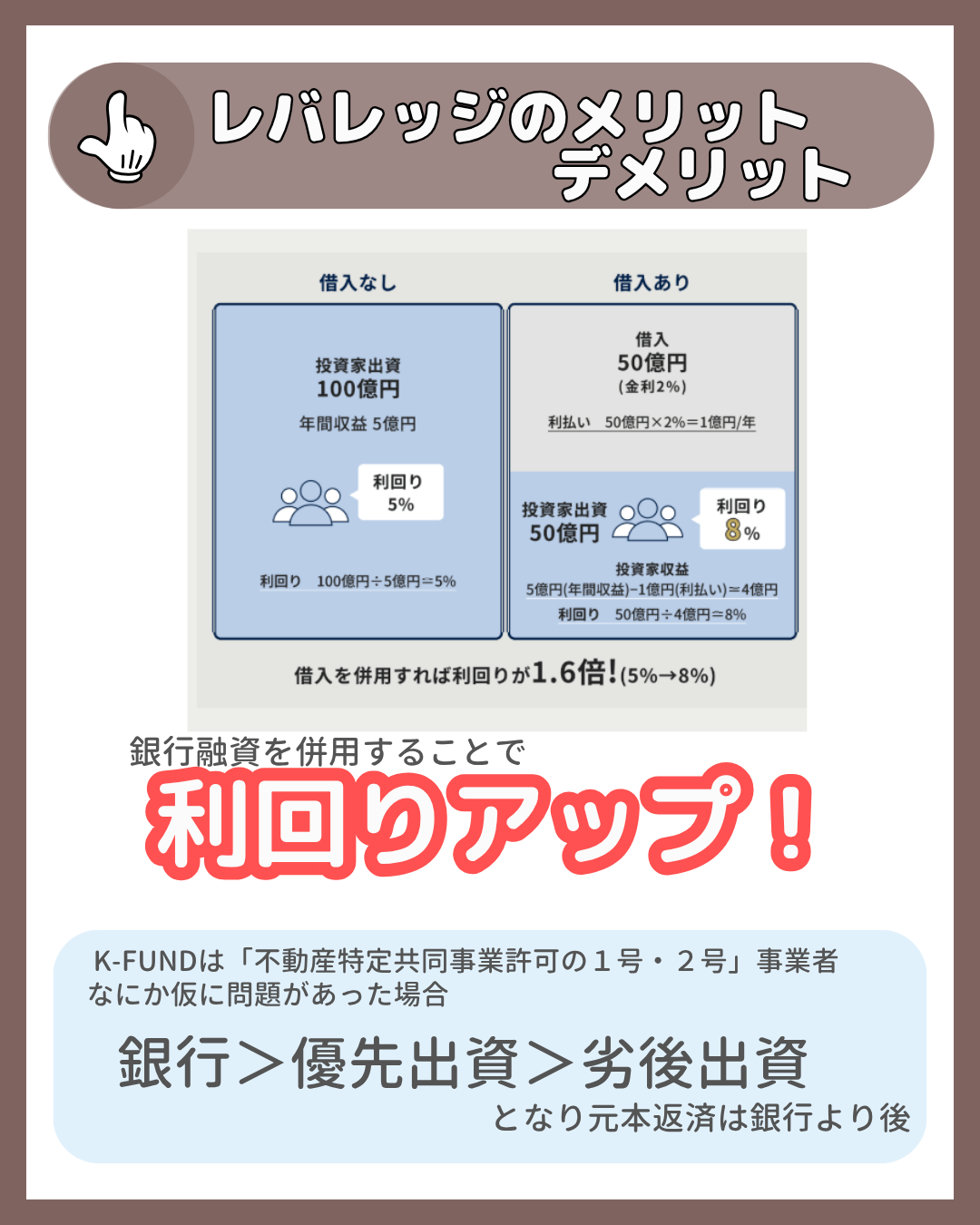 画像引用元:K-FUND公式サイト借入を併用することでレバレッジ効果を出して利回りを上げることができます。