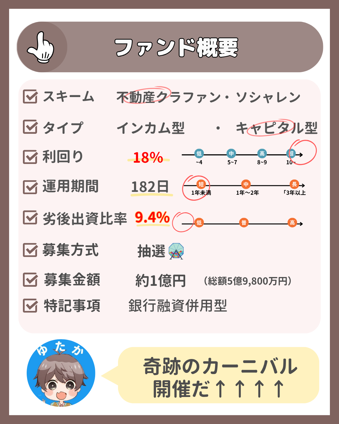 自社勘定で買い戻しをするとの記載があり、1号ファンドから失敗すると今後の募集もうまくいかないですし、ガッチリ決めてくる可能性は高いでしょうと考えております。