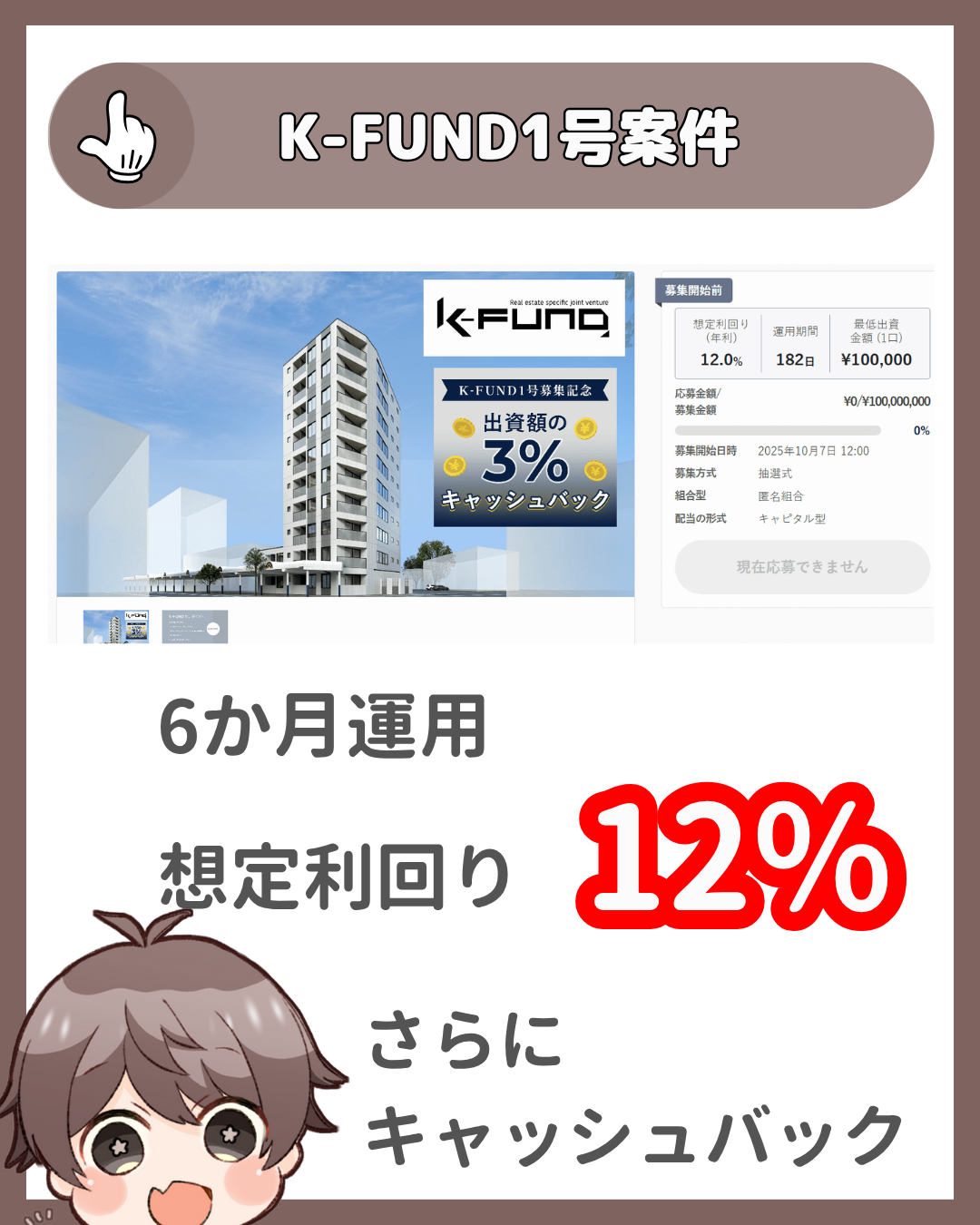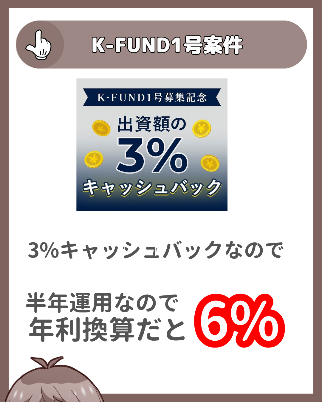 今回のファンドは半年運用になりますので、年利換算にすると利回りは3%ではなく6%に跳ね上がります。