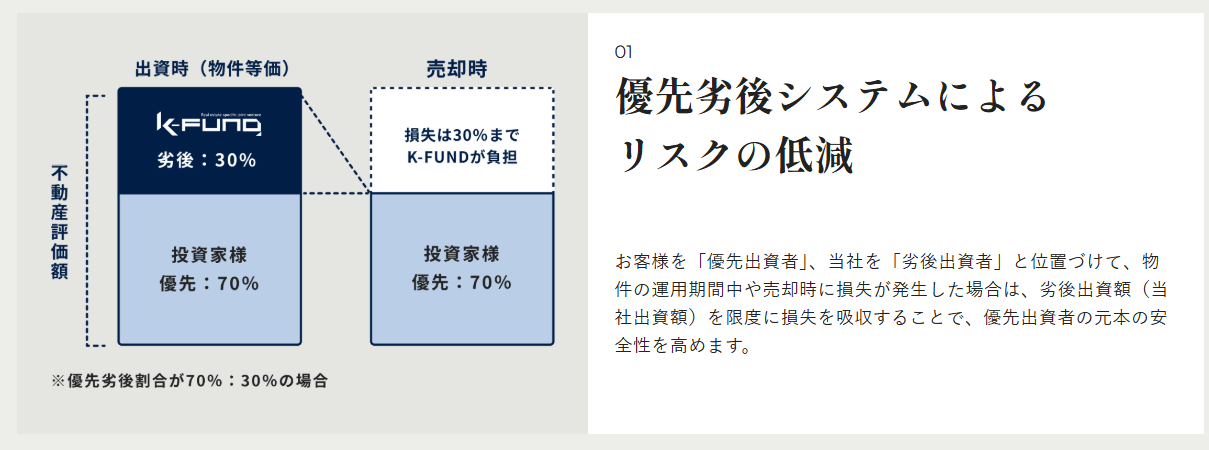 画像引用元:K-FUND公式サイトどこの不動産クラウドファンディングでも劣後出資の仕組みは導入されていますね。