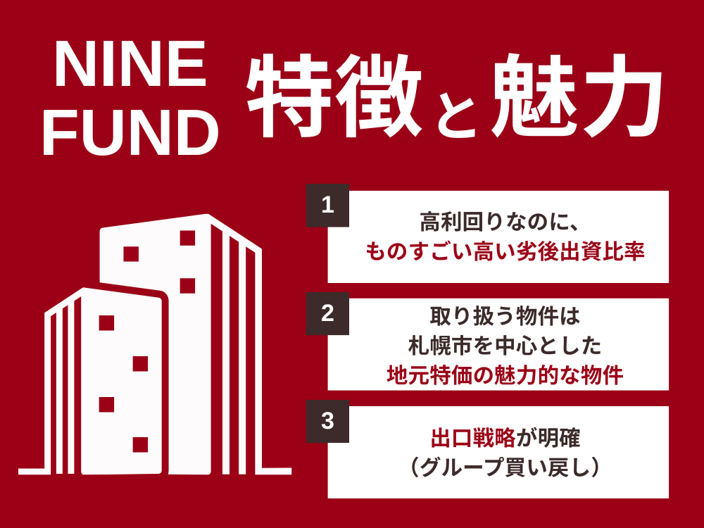 画像引用元:NINE FUND北海道札幌市に本社を置く会社であり、現在は地元の北海道札幌市の物件だけで構成されています。