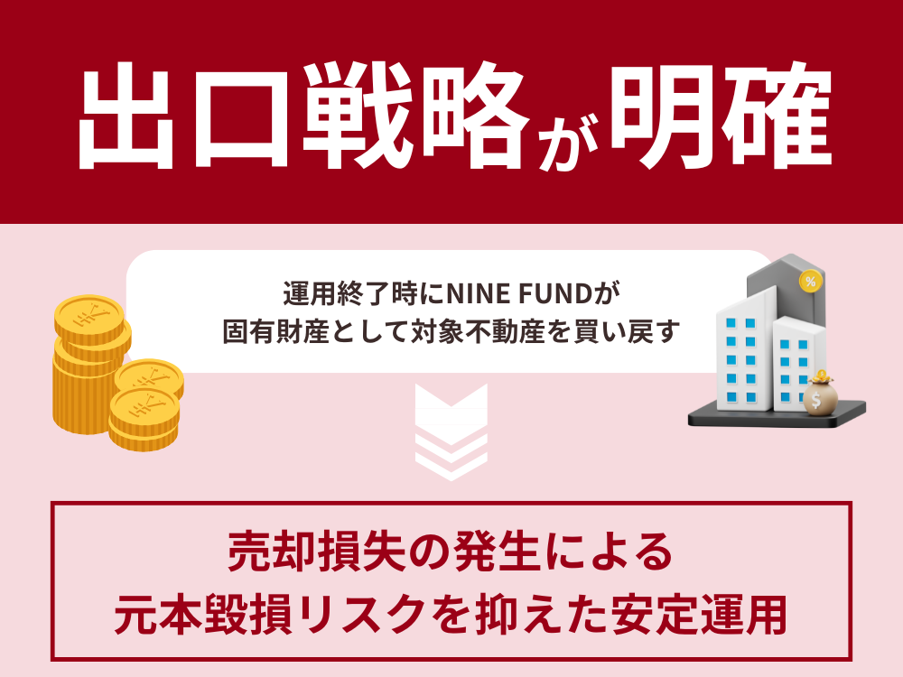 出口戦略として、運用終了時に当社が固有財産として対象不動産を買い戻すため、不動産自体の価格動向や景気の影響を受けにくく、売却損失の発生による元本毀損リスクを抑えた安定運用を目指します。
