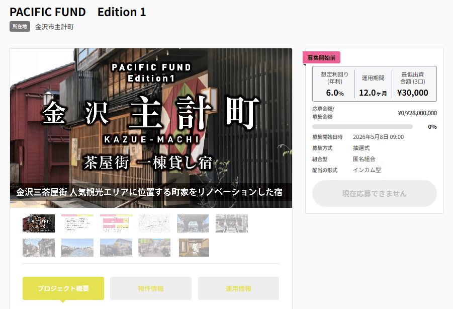 • 宿泊特化型アセット:インバウンド需要を見込める「主計町の町家ゲストハウス」が対象(想定利回り6.0% / 運用12ヶ月 / 劣後20%)。