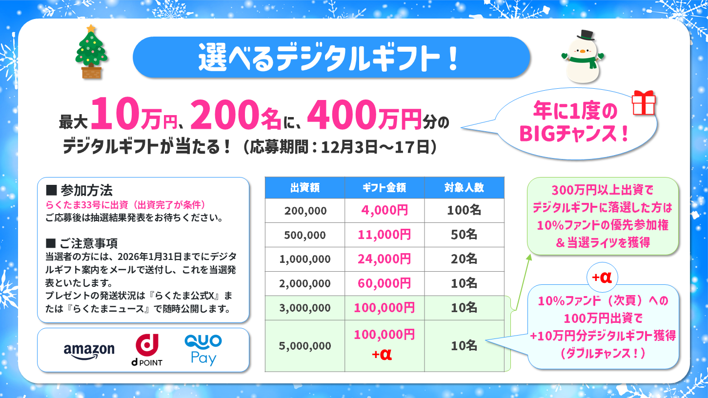 | 500万円以上投資 | 100,000円+α(=来年展開される利回り10%ファンドにて100万円出資した場合、さらにデジタルギフト10万円)(10名) |