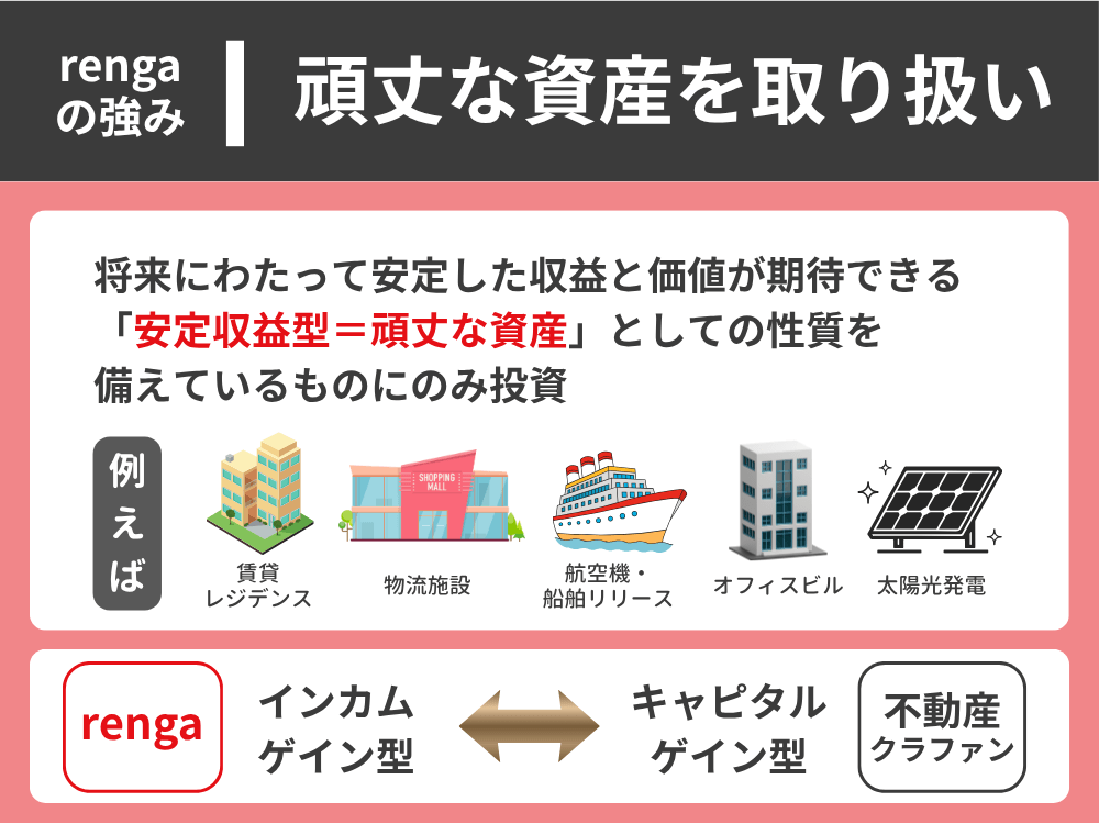 賃料やリース料といった定期的な収益を着実に生み出す“頑丈な資産”を投資先としています。