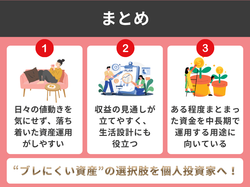 - 日々の値動きを気にせず、落ち着いた資産運用がしやすい