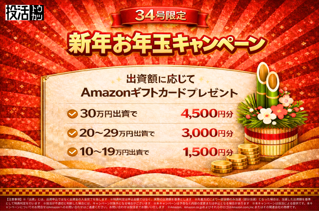 不動産クラウドファンディングの投活にて、34号ファンド限定のお年玉キャンペーンが開催されるので今回まとめてみました。