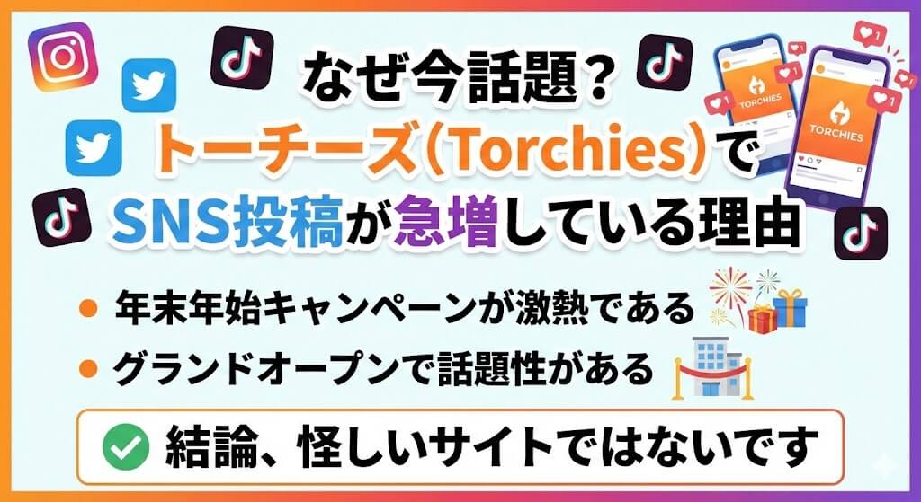 結論から言うと、現在SNSで投稿が増えている理由は、トーチーズが「年末年始投資応援キャンペーン」という大型の還元イベントを開催しているからであり、決して怪しい詐欺ではありません。