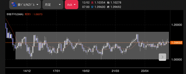 これまでずっとレンジ相場を保ってきている「豪ドル/ニュージーランドドル」の通貨ペアでやっていこうと思います。