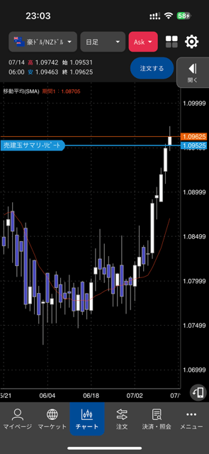 チャートで見るとこんな感じで今ここで売り注文したよ~下がったら利益になるよ~という感じです。のんびり待ってみようと思います!