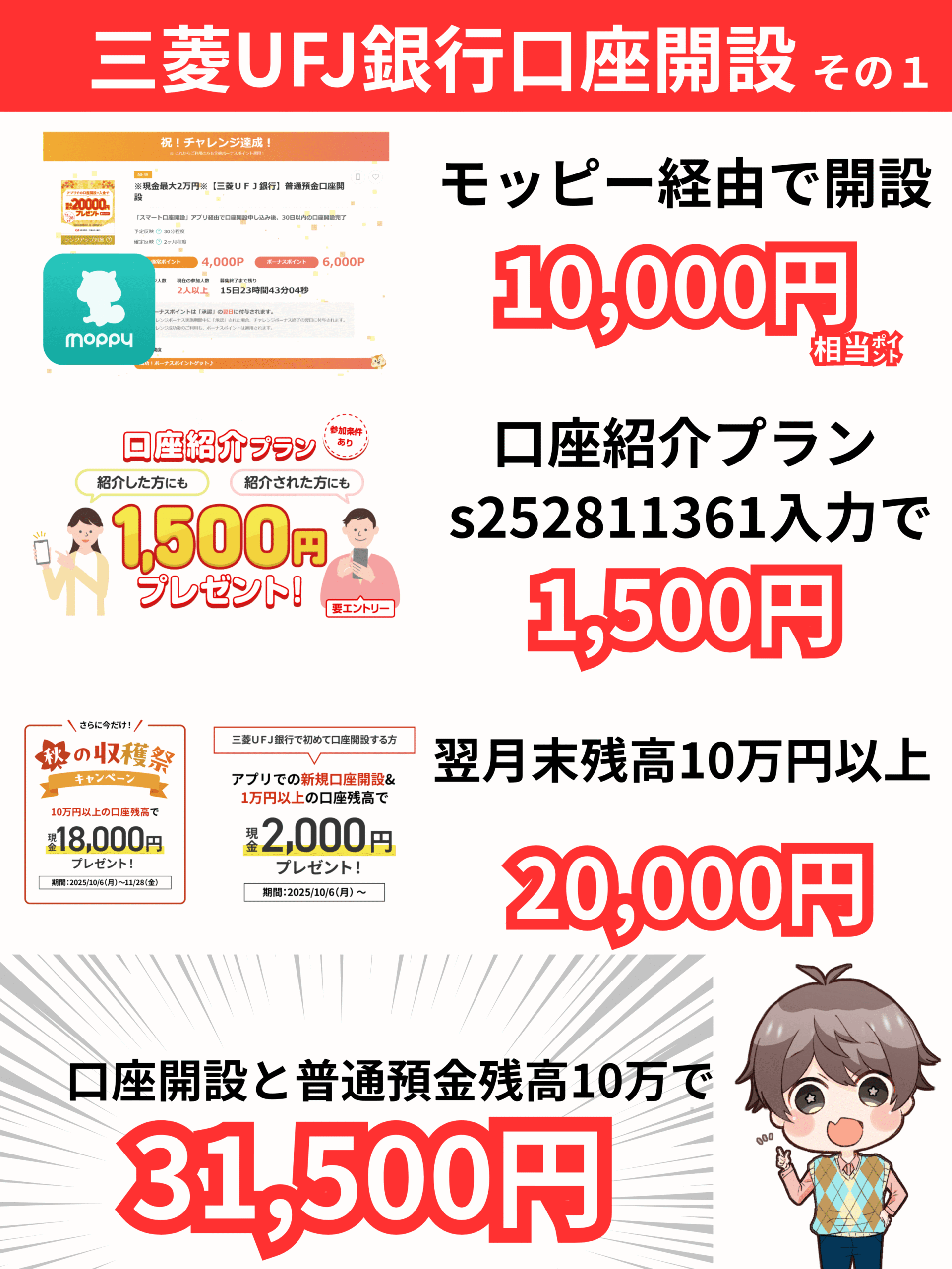 三菱UFJ銀行の口座開設キャンペーンで合計31,500円