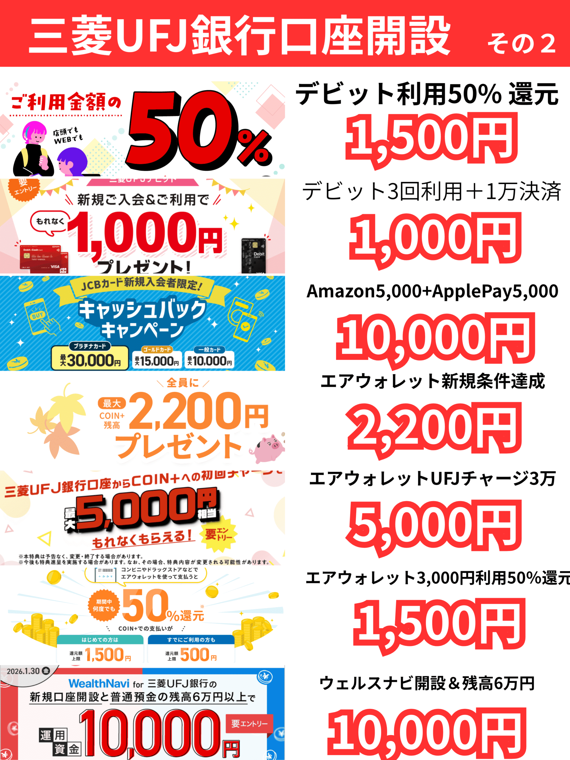 三菱UFJ銀行と三菱UFJカードと三菱UFJ eスマート証券で最大63,200円分でやばいです。