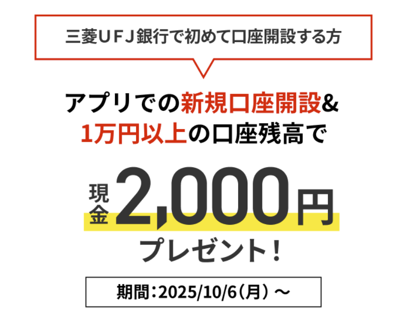 - 三菱UFJ銀行公式特典で翌月末の残高10万円で2万円