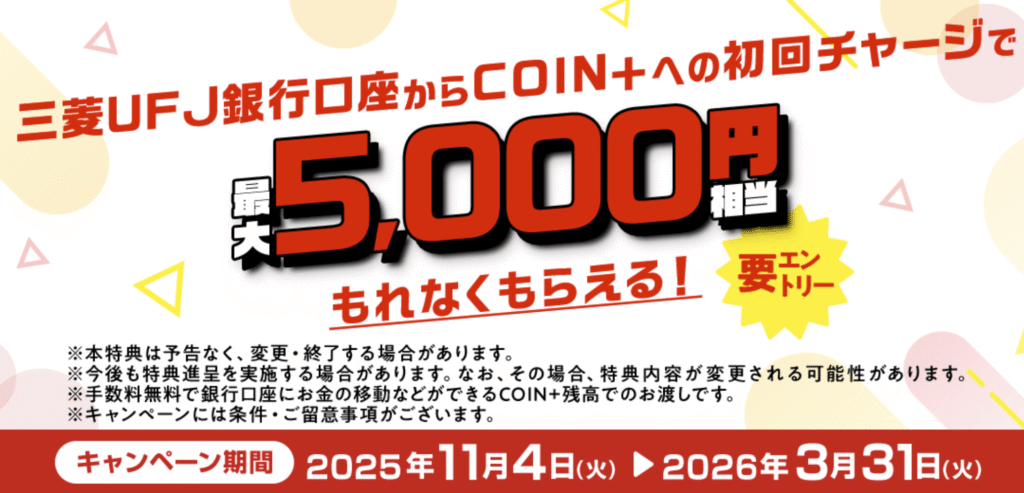 - 三菱UFJ銀行へ3万チャージで5,000円