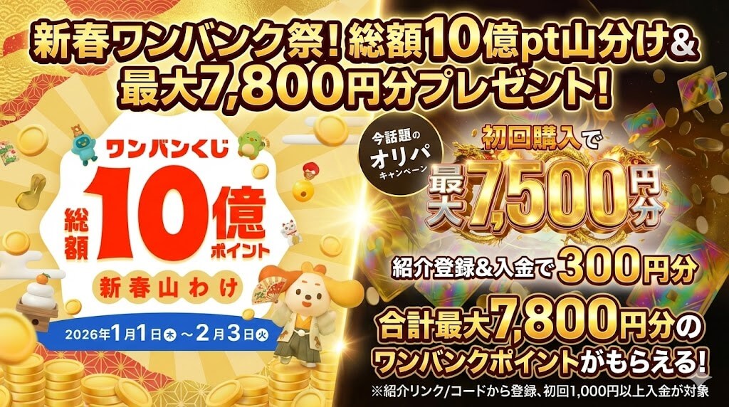 友達紹介で300円、ワンバンクくじで毎週最大1億ポイントの山分けに挑戦、オンラインオリパで5,900円黒字になってワンチャンオリパも当たる。