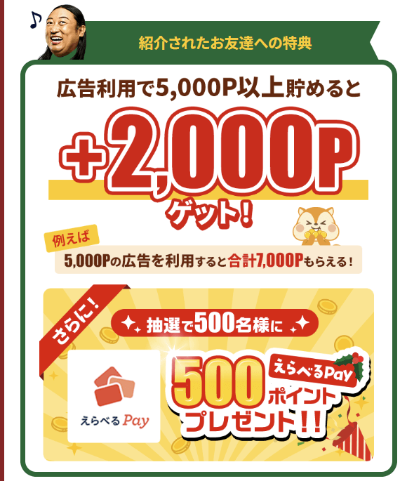 紹介リンクから登録して、入会翌々月末までに合計5,000ポイント以上獲得すると、2,000円分ポイントがもらえる紹介キャンペーンを開催中
