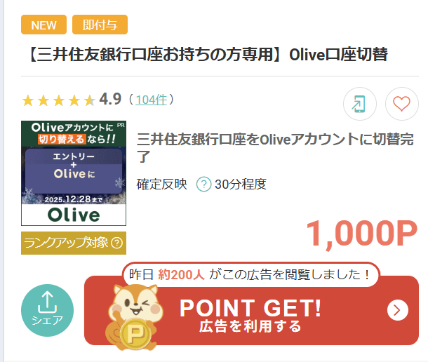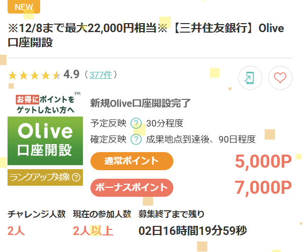 さきほどの、Oliveのポイントは12,000ポイントもらえるのでこれで余裕で達成できます。ただ、ポイント獲得が90日程度と表示されているのでもしかしたら間に合わない可能性もあるので別で広告をやっておくと安心です。